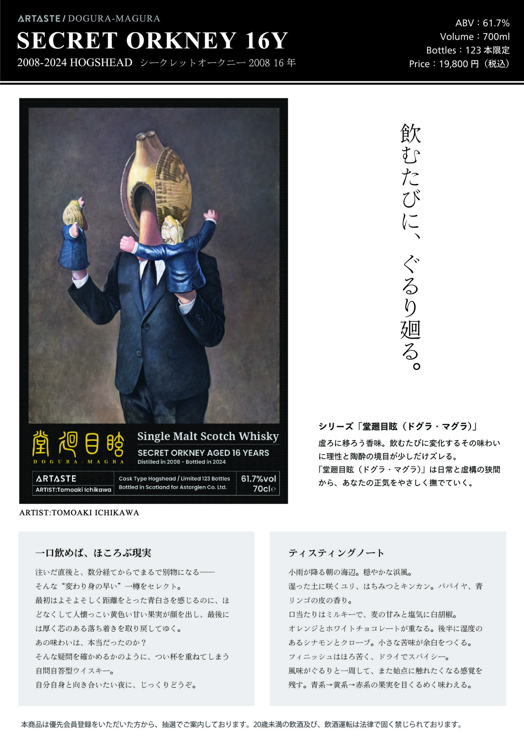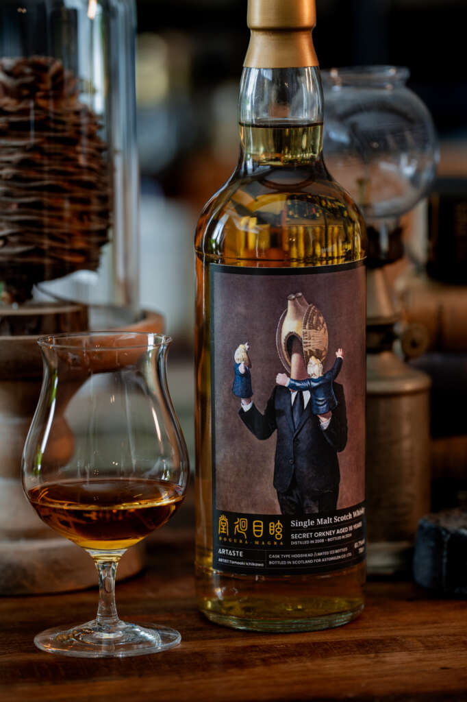 このウイスキーシリーズもその作品や、市川氏のアサリーマンのビジュアルから「虚ろに移ろう香味」と題し、変化に富む不思議なウイスキー樽を選抜してみました。