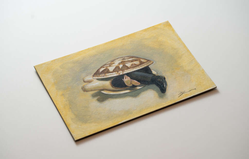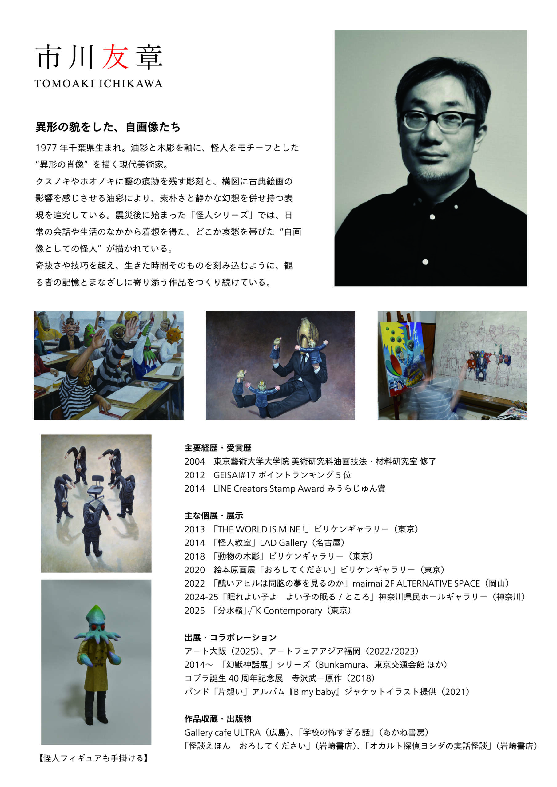 東京藝大で油画を学び、油彩と木彫で“怪人”や“異形”といった一風変わった作品を生み出し続けています。