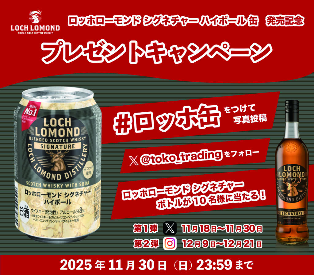 ハイボール缶の発売を記念し、X (旧ツイッター) とインスタグラムで合計10名に「ロッホローモンド シグネチャー」の700mlボトルが当たるキャンペーンが実施されます。