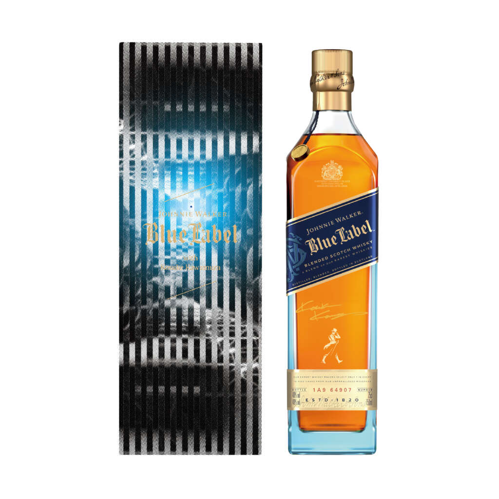 ジョニーウォーカー ブルーラベル(河村康輔氏コラボ限定スリーブ付き) 河村氏のサインが刻印されたボトルと、特製スリーブがセットになった限定品。価格:36,300円(税込)