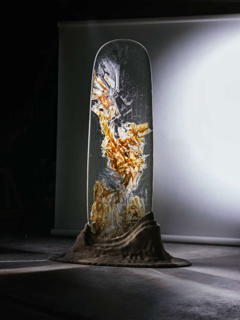 作品は、琥珀色に輝くガラスの層が渦を巻き、ポートエレンのウイスキーの特徴であるスモーキーな香りとフレーバーの層を視覚的に表現しています。ガラスの台座は、アイラ島の複雑な地形の輪郭からインスピレーションを受けており、現代ブロンズアーティストのヤニック・セカーニ氏とのコラボレーションにより、フランスで制作されました。