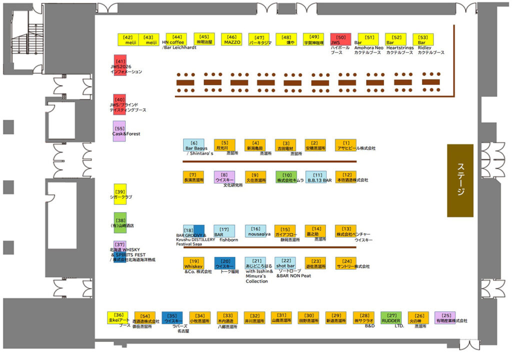 出展はメーカー・蒸溜所、インポーター、酒販店、バーなど合わせて55ブース前後。国産蒸溜所だけでも約30社にのぼります。