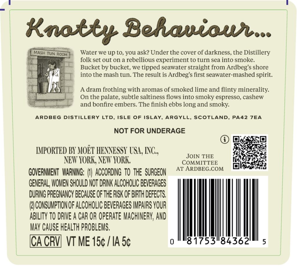 「闇夜に紛れて、蒸溜所の仲間たちが海を煙に変える反逆的な実験に乗り出した。バケツ一杯、またバケツ一杯と、アードベッグの岸辺から直接マッシュタンに海水を注ぎ込んだ」——これがラベルに書かれた言葉です。アードベッグらしい演出ですが、やっていることは本物です。
