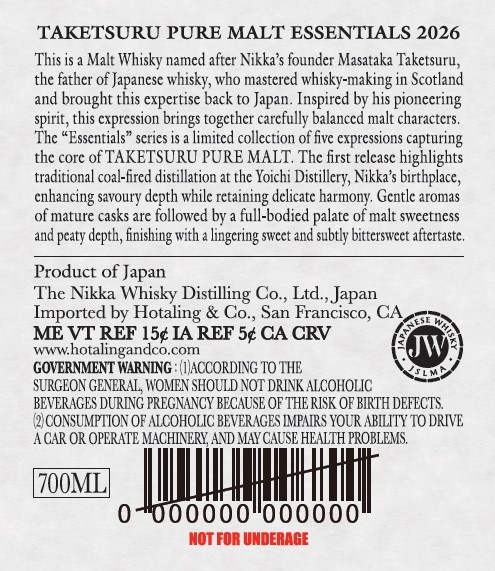 ニッカウヰスキーが竹鶴ピュアモルトの新シリーズ『竹鶴ピュアモルト エッセンシャルズ』を準備していることが、米国アルコール・タバコ税貿易局(TTB)へのラベル申請によって明らかになりました。